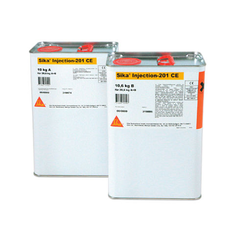 Sika® Injection-201 CE – це двокомпонентна еластична поліуретанова ін'єкційна смола, без розчинників, з дуже низькою в'язкістю. У контакті з водою утворює однорідну структуру із закритими порами, яка постійно лишається еластичною та водонепроникною.