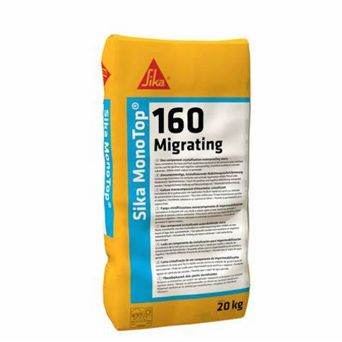 Sika MonoTop®-160 Migrating являє собою 1-компонентну, цементну гідроізоляційну суспензію, що модифікована підібраними заповнювачами та активними хімічними речовинами. Активні компоненти мігрують в пори та капіляри бетону і реагують з наявною вологою і вільним вапном з утворенням нерозчинної кристалічної структури всередині цементного каменю. Суспензію можна наносити щіткою або розпилювачем, що з часом забезпечує водонепроникний шар для запобігання проникненню води до всіх типів бетонних конструкцій.