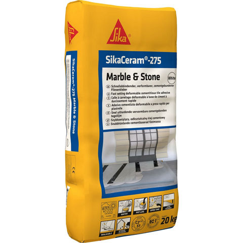SikaCeram®-275 Marble & Stone це модифікований білим полімером, швидко тужавний, з можливістю зміни консистенції, еластичний, морозостійкий клей для підлоги та стін з високою покривною здатністю зі зниженим сповзанням і подовженим відкритим часом. Для керамічної плитки малих, середніх і великих розмірів у вологих і сухих житлових, промислових, комерційних приміщеннях. Підходить для приклеювання всіх типів керамічної, мармурової та мозаїчної плитки, також натурального каменю до всіх типів будівельних матеріалів, що вбирають і не вбирають вологу. Товщина шару ≤ 30 мм. Для застосування всередині приміщень і назовні. EN 12004: Класифікація - C2 FTE S1 для консистенції в тонкому шарі та C2 FE S1 для рідкої консистенції.